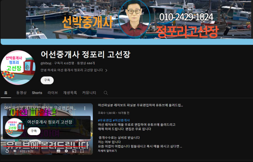 아래 주소를 링크 하시면 바로 어선중개서 정포리 고선장 유튜브 체널로 이동 합니다